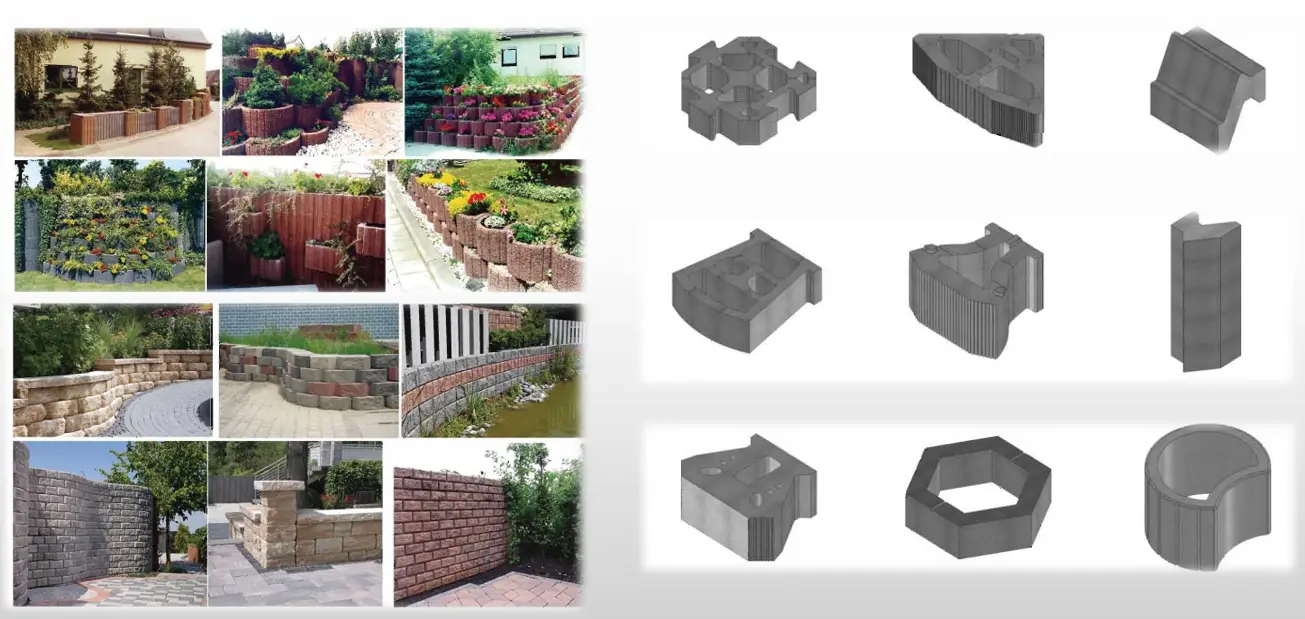 Многофункционалните форми за блокови машини обикновено се използват заедно с блокови машини. Чрез подмяна на различни форми могат да се произвеждат различни видове блокове, като порести тухли, кухи блокове, бордюри, тухли за настилка, тухли за засаждане на дървета, тухли за защита на склонове и други циментови продукти. Продуктите, образувани от многофункционални блокови машинни форми, са много стабилни и имат нисък процент на скрап. Дизайнът на многофункционалните блокови машинни форми им позволява да се адаптират към различни производствени нужди и продукти с различни спецификации могат да бъдат произведени чрез проста подмяна на формата. Многофункционалните блокови машинни форми са изработени от високопрецизни и високоякостни материали и имат добра устойчивост на износване, за да удължат експлоатационния живот. Многофункционалните блокови машини са лесни за подмяна и поддръжка.